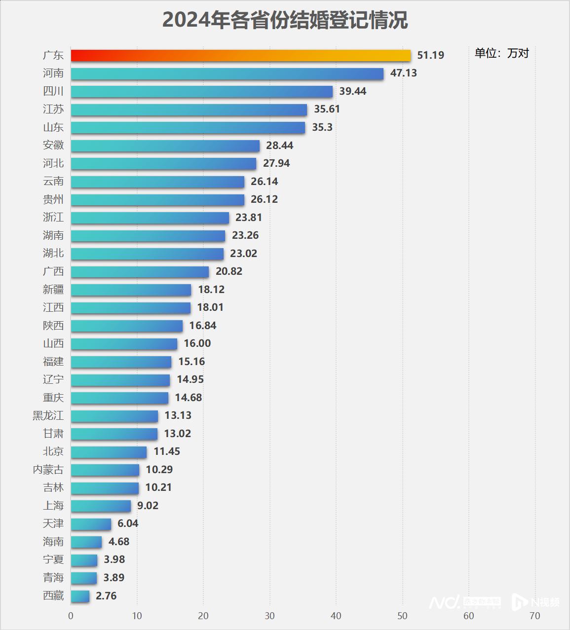 此外,《中國統計年鑒2025》數據顯示,2024年廣東結婚登記對數為51.19萬對,數量全國最多,其中,初婚人數為83.19萬人,再婚人數為19.19萬人。值得一提的是,廣東也是去年全國唯一結婚登記數量超過50萬對的省份。
